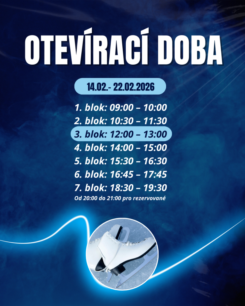 během jarních prázdnin 2026 (od 14. do 22. února) bude veřejné bruslení na venkovním kluzišti rozšířeno v týdnu navíc o časový blok od 12:00 do 13:00 hod. Provoz bude probíhat o prázdninách v následujících časech: