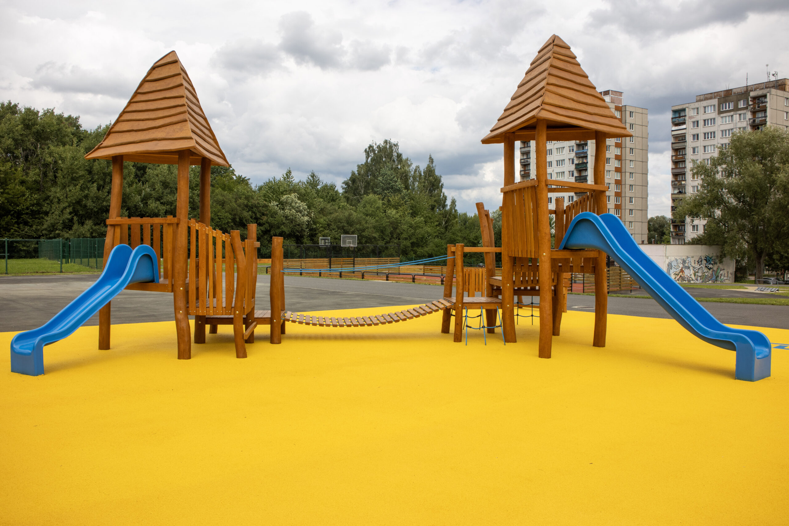V areálu se nachází ohraničená sportovní plocha, která nabízí širokou škálu možností pro aktivní trávení času. Na venkovní straně plochy jsou dvě streetballové hřiště, ideální pro rychlé zápasy a zábavu s přáteli. Uvnitř areálu je hlavní basketbalové hřiště, vybavené pro klasické utkání, a branky, které mohou posloužit pro fotbal nebo florbal. Kolem celého hřiště se rozprostírá asfaltová plocha, která je perfektní pro jízdu na kole, skateboardu nebo koloběžce, čímž nabízí ještě širší možnosti pro sportovní vyžití. Druhou částí areálu je skate park, vybavený rampami, boulí a překážkami, které umožňují skvělé triky a zlepšování dovedností.